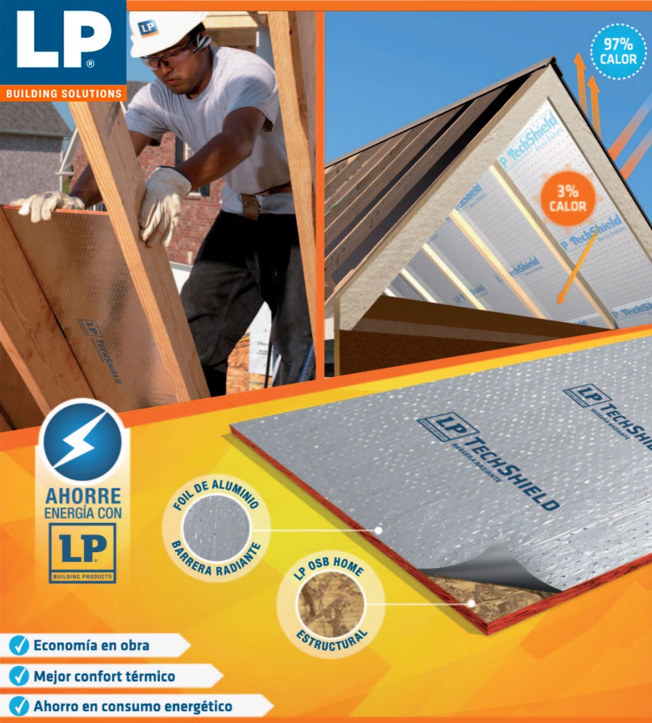 Tablero estructural OSB con certificación APA que integra en una de sus caras una barrera radiante de aluminio con incisiones, diseñado para mejorar la eficiencia energética de la vivienda y el confort habitacional